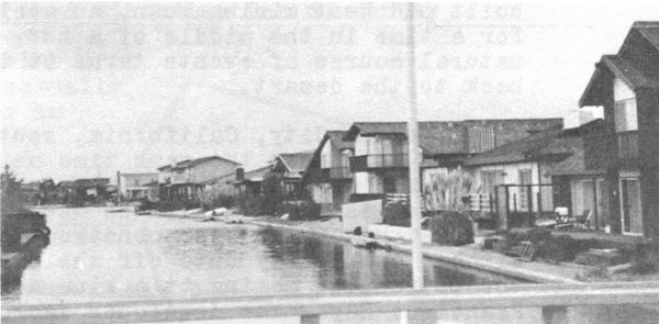 Attractive waterside homes at Foster City, California, “the island of blue lagoons.” The houses are yet to be joined by planned industry, shopping and town center that were to be built long ago in this attractive but incomplete and financially ailing new town project.
